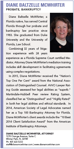 She previously received the Bronze Service Award from the Florida Supreme Court for her volunteer legal service to the community. Diane B. McWhirter, Attorney, is a past Chair of the Elder Law and of the Estate Guardianship and Trust Committees of the Orange County Bar Association.
